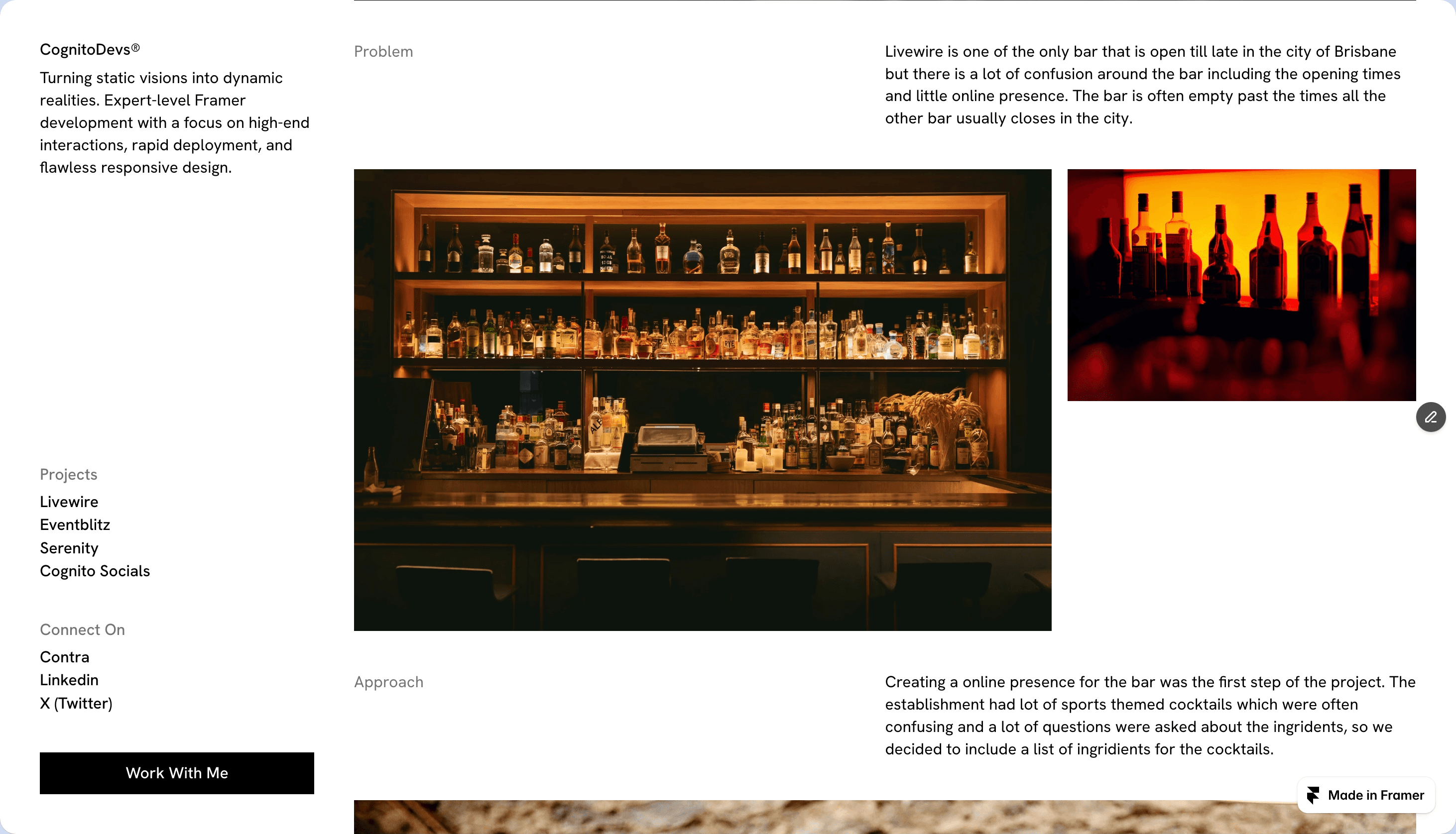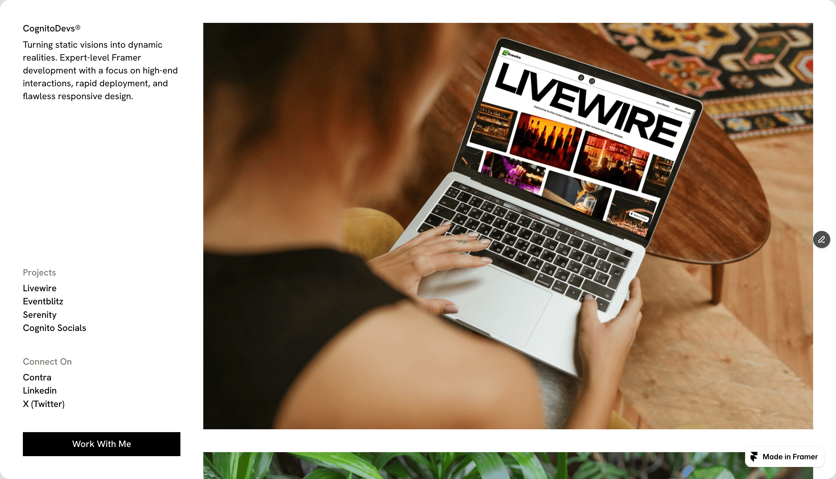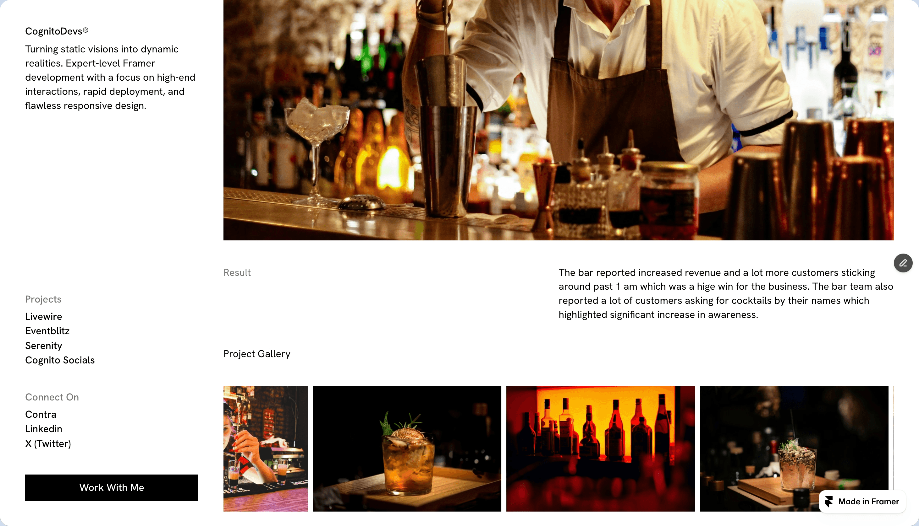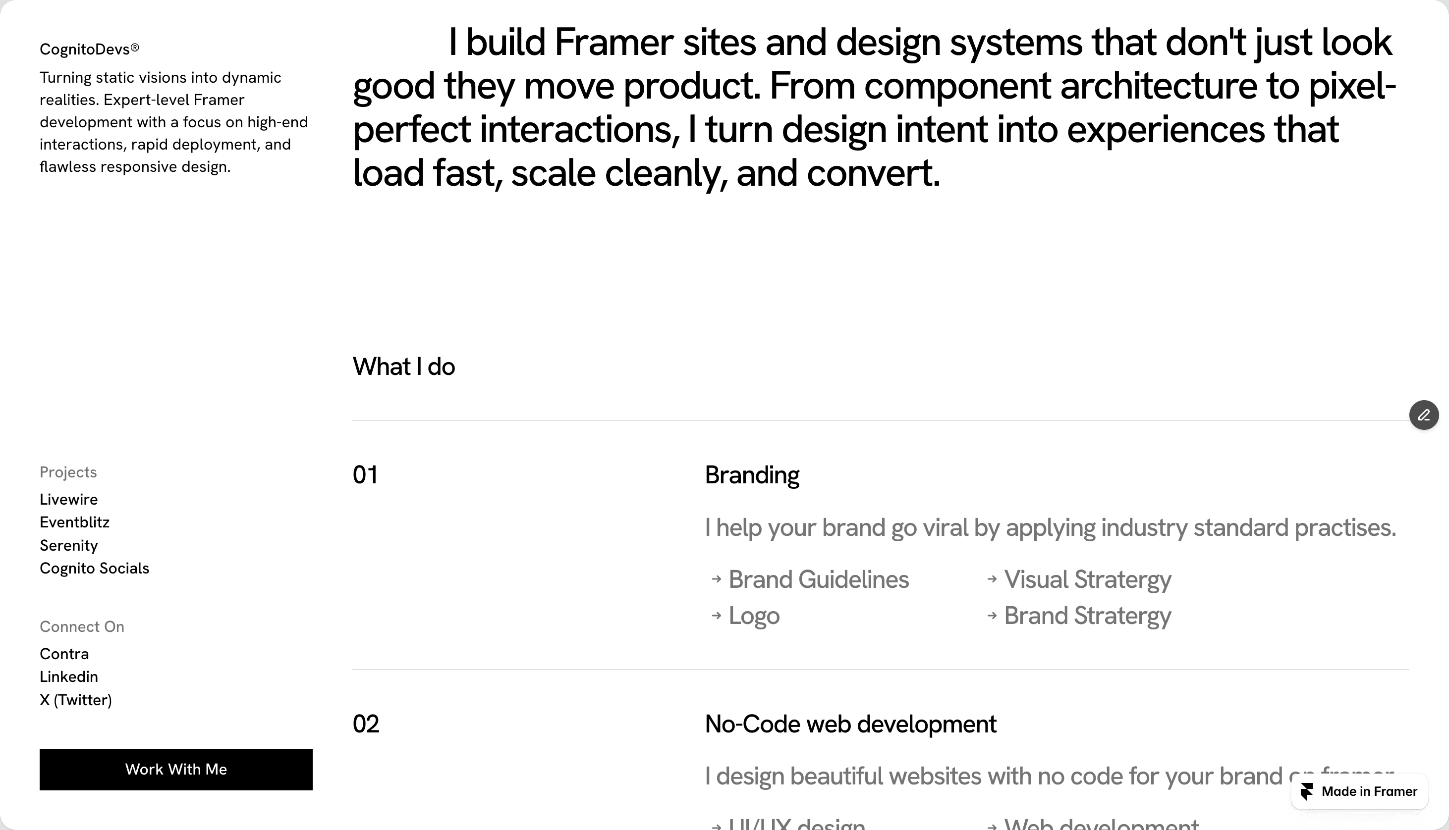 Framer ticker effects show up in a few spots. A scrolling headline. A looping skills list. A number that counts. Not a lot of them, and not loud. Just enough movement to make the page feel like it's running, not frozen.