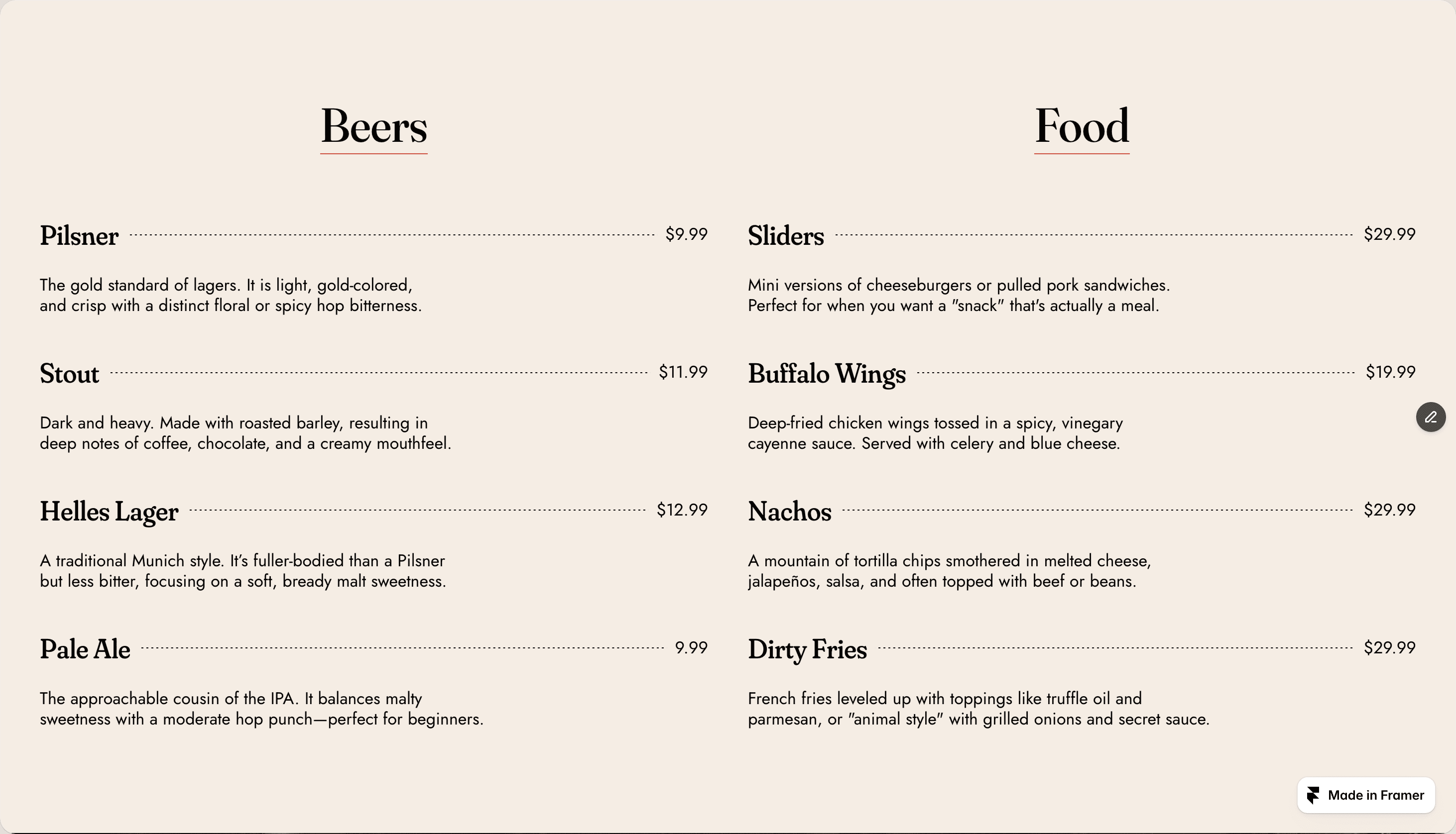 Menus are CMS-powered. Your team updates specials, rotates seasonal items, or swaps out the tap list without filing a support ticket. It just works that way out of the box.