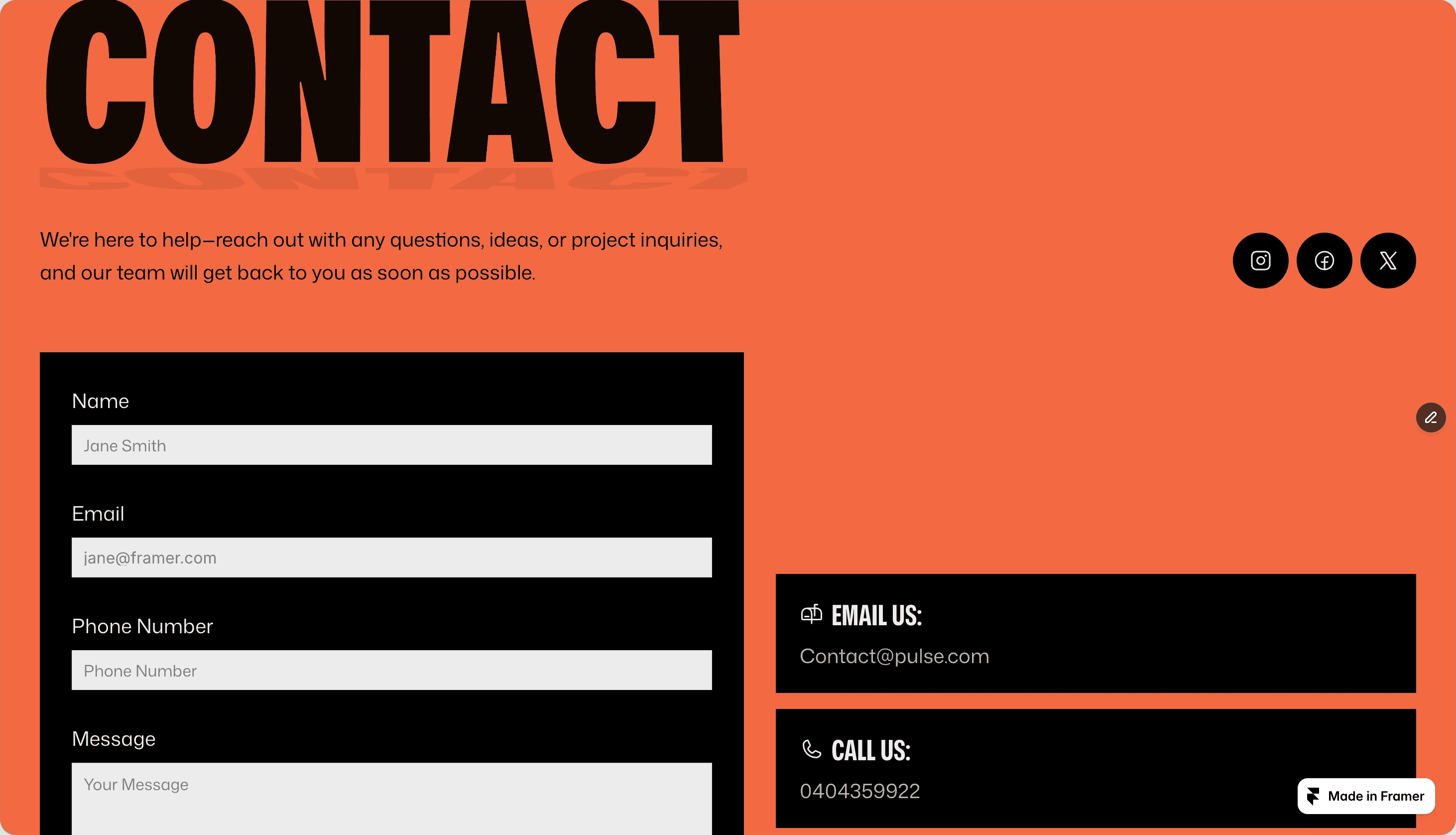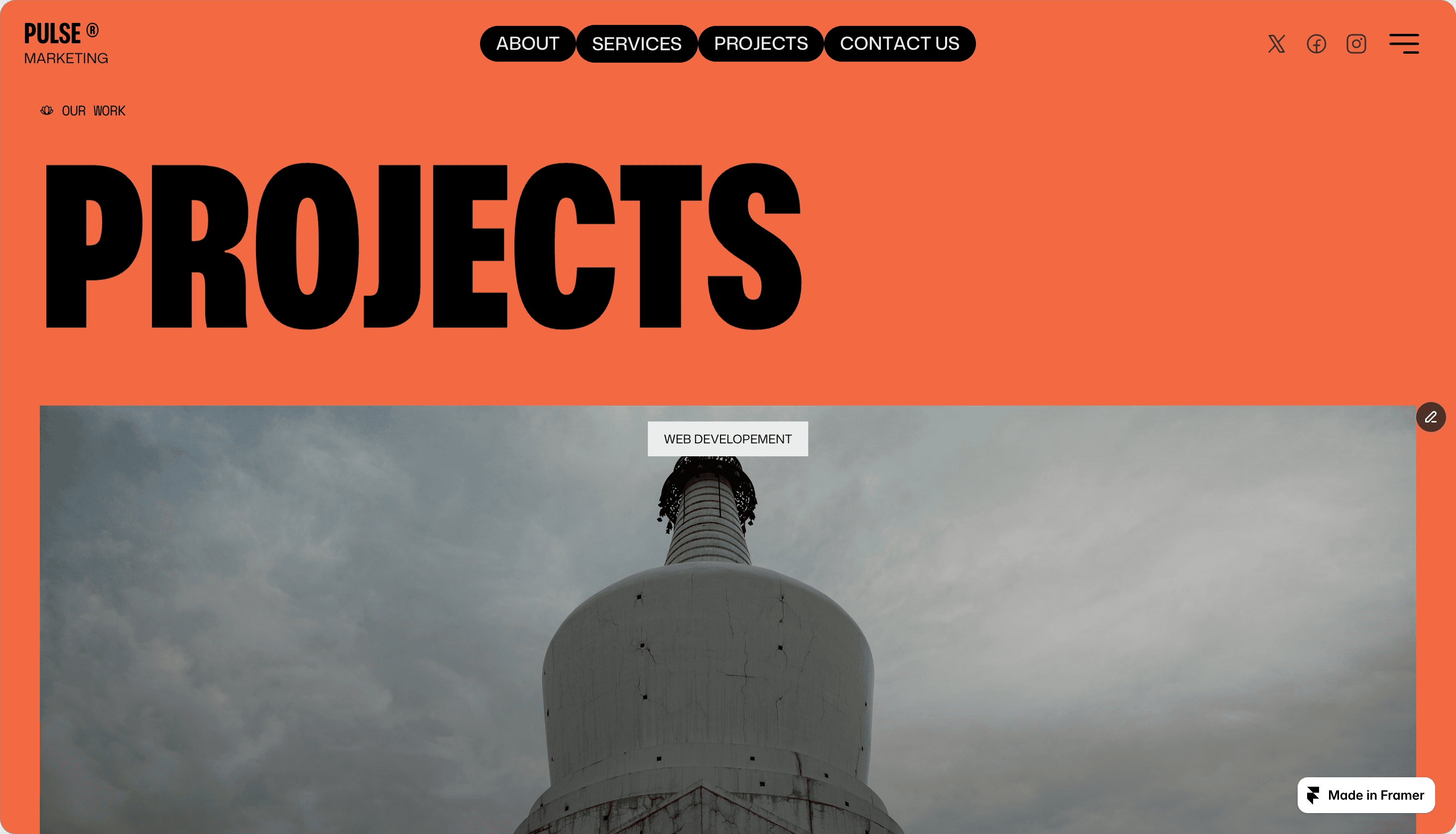 Pulse leads with type. Big type — the kind that takes up most of the viewport and makes you read it before you do anything else. For marketing and creative agencies, that's not a styling choice, it's an argument. Your positioning statement deserves more than a caption.