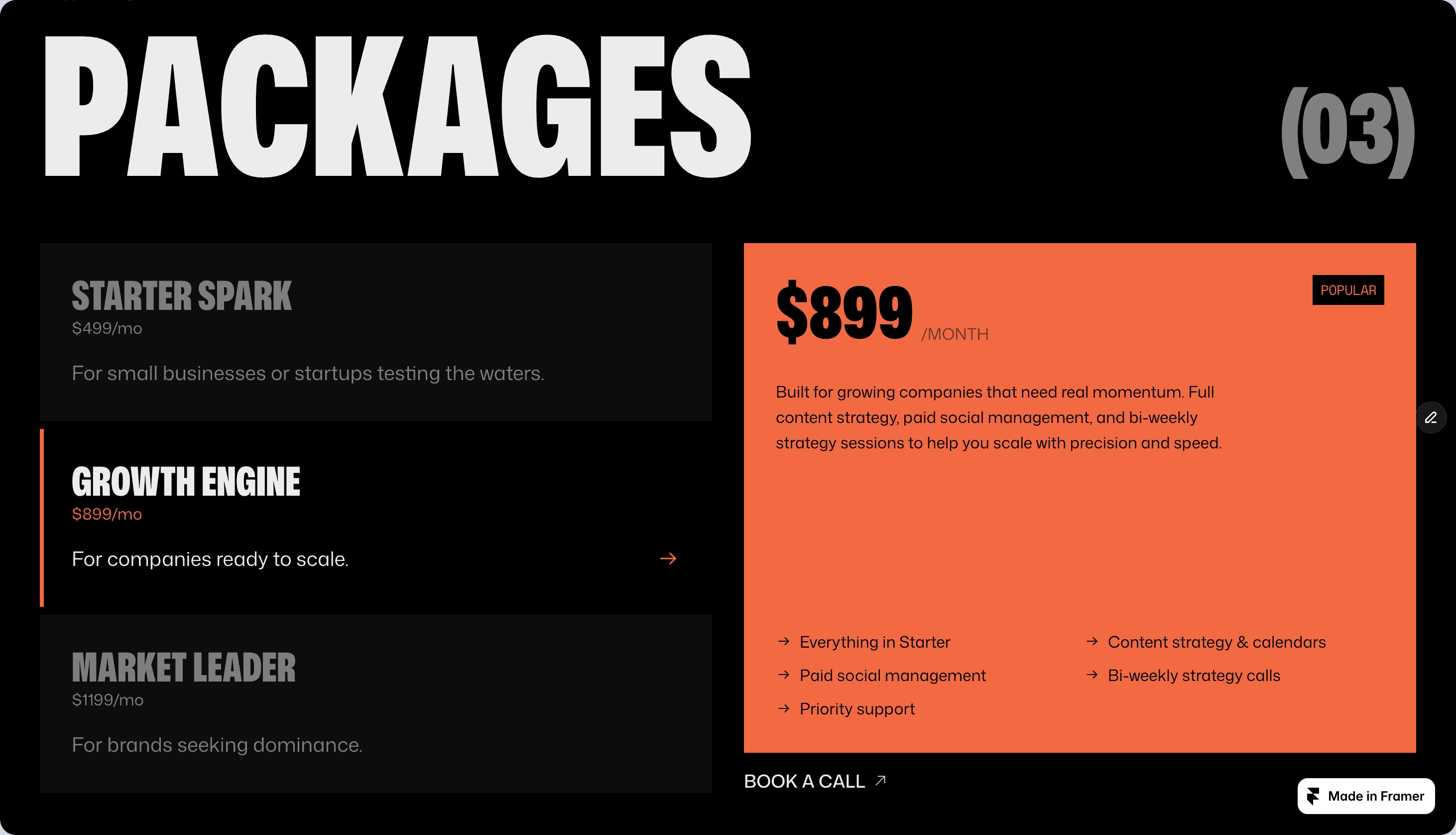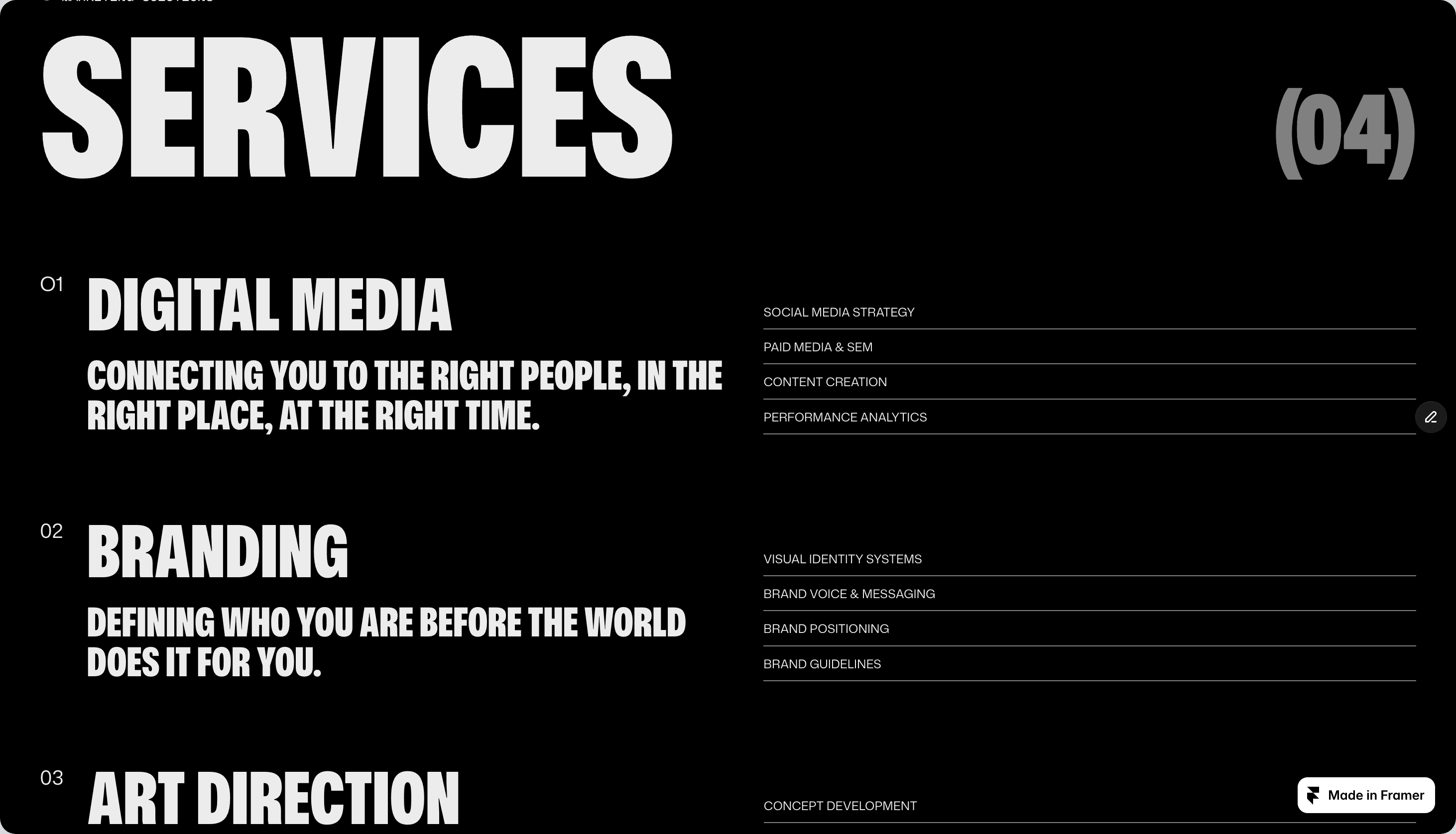 Tickers show up in the right places. Client names looping below the fold. A services line moving across the footer. A stat that scrolls instead of sits. They keep the page moving between sections without adding noise. Premium sites tend to be in motion without being busy — this template understands that difference.